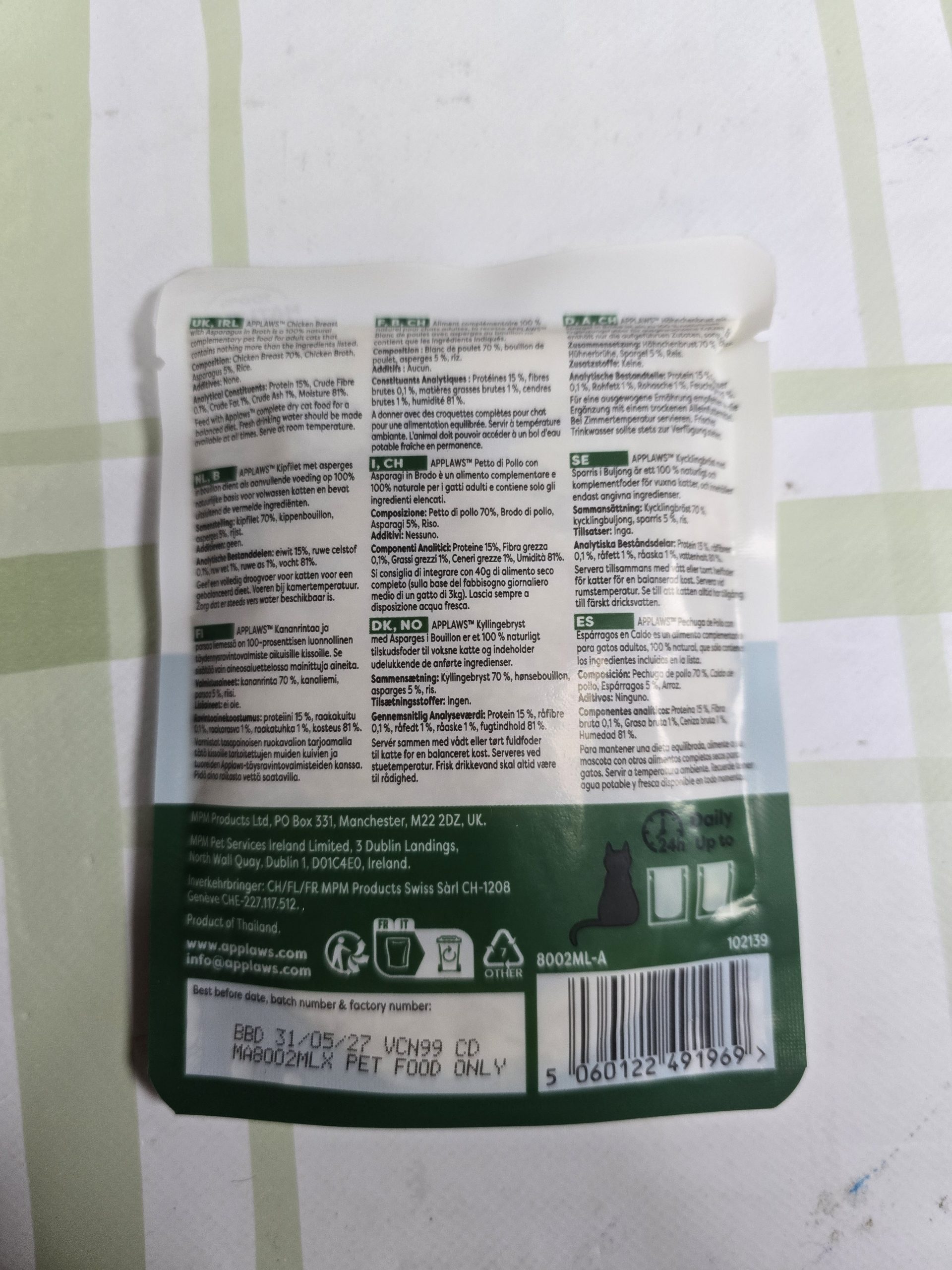 Applaws Chicken Breast with Asparagus in Broth is a 100% natural complementary pet food for adult cats that contains nothing more than the ingredients listed.