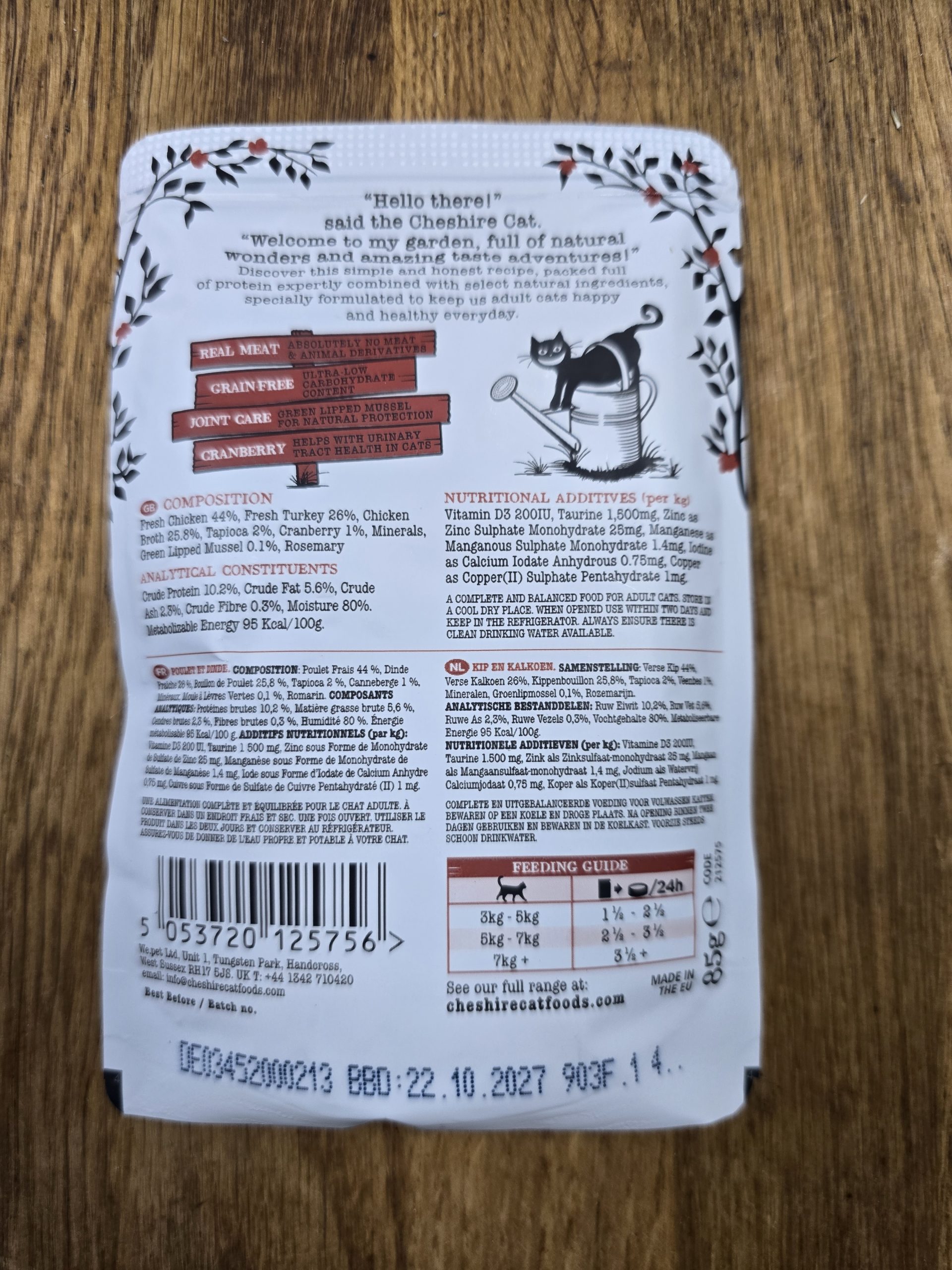 Fresh Chicken 54%, Fresh Turkey 26%, Chicken Broth, Cranberry 1%, Minerals, Green Lipped Mussel & Rosemary.